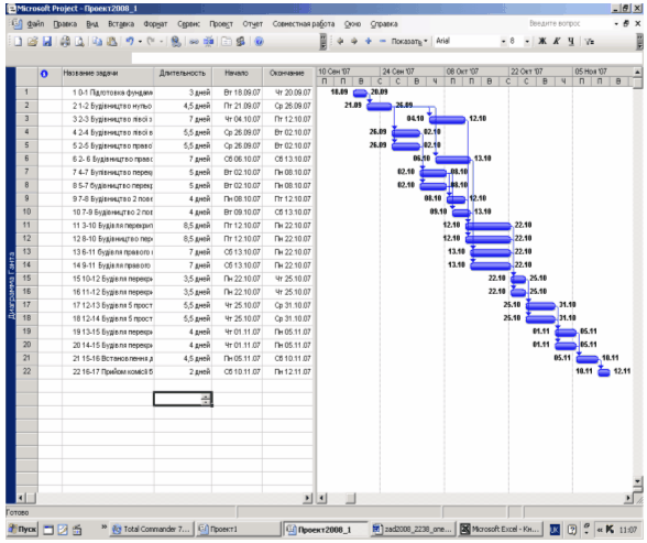 В табл.1 наведені результати побудови діаграми Ганта при введенні кодованих робіт (код та назва робіт) і їх тривалості, враховуючи 2- х змінний (по 8 годин) режим роботи у вихідних даних проекту. Кожна робота логічно пов”язується з попередніми: