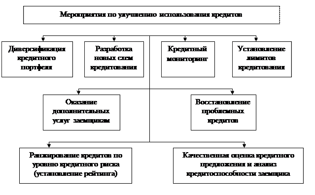 Рис. 2.1. Управленческие решения по улучшению использования кредитов Диверсификация ссудного портфеля означает распределение, рассеивание кредитного риска по нескольким направлениям. Банки должны ограничивать кредитование одного или нескольких крупных заемщиков либо предоставление крупного кредита группе взаимосвязанных заемщиков. Соблюдение нормативов кредитных рисков, содержащихся в инструкции № 1 ЦБ РФ от 1.10.1997 г. "О порядке регулирования деятельности кредитных организаций", очень важно для снижения кредитного риска. Необходимо придерживаться правила диверсификации ссудного портфеля при пересмотре структуры кредитного портфеля: выдавать ссуды различным предприятиям из различных отраслей экономики меньшими суммами на более короткий срок и большему числу заемщиков. Как дополнительное условие снижение риска должна применяться диверсификация обеспечения возврата кредитов на основе сочетания различных способов обеспечения возврата ссуд – залога, гарантий, поручительств, страхования. Соблюдение этих правил позволяет компенсировать возможные потери по одним кредитным сделкам выгодами от других. Лимиты кредитования являются ориентирами при формировании диверсифицированного кредитного портфеля. Основной способ контроля формирования кредитного портфеля – определение и установление лимитов кредитования, используемый для уменьшения рисков и улучшения банковской деятельности. Это позволит банку: избежать критических для сохранения платежеспособности потерь от необдуманной концентрации любого вида риска, а также диверсифицировать кредитный портфель с целью сокращения концентрации и обеспечения стабильной прибыли. Кроме того, установление кредитных лимитов как способ определения пределов кредитных полномочий способствует ускорению и повышению эффективности принятия кредитных решений, поскольку снижает нагрузку на правление банка, которое не может участвовать в принятии решений по каждой кредитной заявке. Банки по-разному подходят к вопросу определения лимитов, но обычно кредитные лимиты подразделяются на следующие группы: лимиты по регионам (странам); отраслевые лимиты; лимиты кредитования одного заемщика. При установлении лимитов кредитования учитываются также общие ограничения, влияющие на деятельность банка, что выражается в установлении лимитов по срокам и валюте кредитования, а также по типу обеспечения кредита. Обычно лимиты устанавливаются в виде нормативов (в процентах), а в некоторых случаях в виде абсолютных предельных величин. В качестве базы при расчете норматива может использоваться объем собственного капитала или размер кредитного портфеля, реже – некоторые другие показатели. Совокупный размер кредитного портфеля используется в качестве базы для расчета лимита кредитования при определении доли потерь в результате кредитной операции, которая может быть покрыта за счет доходности существующего портфеля. В любом случае использование той или иной базы связано с тем, какие цели ставит перед собой банк при реализации каждой конкретной сделки. Отраслевая концентрация является одной из основных областей анализа кредитного портфеля банка, поскольку существует значительное количество примеров того, как банки несли значительные убытки вследствие переконцентрации отрасле