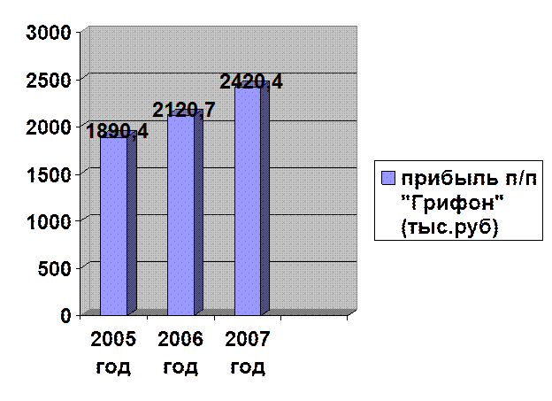 1.Обьем продаж в натуральном выражении составляет 4500 шт. 2.Средняя оптовая цена составила 400 р. 3.Объем продаж в отпускных ценах получаем путем умножения объема выпуска в натуральном выражении на оптовую цену одного изделия. 4500*400=1800000(руб.) 4.Затем исчислим налог на добавленную стоимость (18%), для этого полученную сумму разделим на 118 и умножим на 18. 1800*18/100=274.6(тыс.руб.) 5.Объем продаж без НДС представляет собой чистую выручку нашего предприятия. Она равна объему продаж в оптовых ценах. 1800-274.6=1525.4(тыс.руб.) 6.Себестоимость выпущенной продукции рассчитываем как произведение объема продаж в натуральном выражении на полную себестоимость единицы изделия. 280*4.5=1260(тыс.руб.) 7,8Разница между чистой выручкой и себестоимостью объема продаж представляет собой валовую прибыль предприятия. При составлении бизнес-плана в нашем варианте не учитываем расходы от прочей реализации и внереализационные расходы и доходы (считаем, что они равны нулю). Тогда балансовая прибыль будет равна валовой. 1525.4-1260=265.4(тыс.руб.) 9.Балансовая прибыль представляет собой базу, для которой исчисляется налог на прибыль согласно Налоговому кодексу РФ. В настоящее время существует единая ставка налога на прибыль, она составляет 24%. 265.4*24/100=63.7(тыс.руб.) 10.Чистая прибыль в распоряжении предприятия – величина прибыли после налогообложения. Как правило, она самостоятельно распределяется предприятиями между специальными фондами и в соответствии с целями. 265.4-63.7=201.7(тыс.руб.) 11.Доходность продаж – частное от деления балансовой прибыли на объем продаж в оптовых ценах и умноженное на 100%. 265.4*100/1525.4=17.4% 12.Норма прибыли – процентное отношение чистой прибыли, оставшейся в распоряжении предприятия к объему продаж в оптовых ценах. 201.7/1525.4*100=13.2% 13.Затраты на 1 рубль продаж получаем путем деления себестоимости выпуска на объем продаж в оптовых ценах. 1260/1525.4=0.83(руб.) Чистая прибыль, остающаяся в распоряжении предприятия после обязательных платежей в бюджет, говорит о том что предприятие «Грифон» в месяц получает прибыль в размере 201700 руб. только от продаж женских сумок из искусственной кожи, и это довольно хороший показатель. Так же затраты на 1 рубль продаж составляют 83 копейки. Диаграмма 1. Рост прибыли предприятия «Грифон» за последние 3 года.