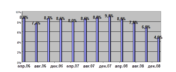 Рисунок 3 – Уровень роста ВВП в Аргентине (апрель 2006 – январь 2009) Источник: составлена автором по данным [17] Значительны позиции иностранного капитала (преимущественно американского) в таких отраслях промышленности как автомобилестроение, электротехническая, нефтехимическая, фармацевтическая). Таблица 3 – Основные макроэкономические показатели Аргентины по годам