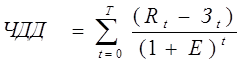 Рассмотрим основные показатели экономической эффективности инвестиционных проектов. 2.2 Чистый дисконтированный доход (ЧДД) Чистый дисконтированный доход (ЧДД) определяется как разница между приведенными к настоящей стоимости суммой чистого денежного потока за период эксплуатации инвестиционного проекта и суммой инвестиционных затрат на его реализацию. Если в течение расчетного периода не происходит инфляционного изменения цен или расчет производится в базовых ценах, то величина ЧДД для постоянной нормы дисконта вычисляется по следующей формуле: