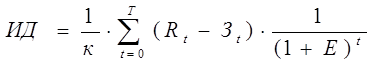 где Rt - результаты, достигаемые на t-м шаге расчета; З t - затраты, осуществляемые на том же шаге; T - временной период расчёта E - норма дисконта, равная приемлемой для инвестора норме дохода на капитал. В том случае, если ЧДД инвестиционного проекта положителен, проект является эффективным (при данной норме дисконта) и предпринимательской фирме следует принять его к реализации. При этом чем больше ЧДД, тем эффективнее инвестиционный проект. Если же ЧДД проекта отрицательный, то такой инвестиционный проект следует отвергнуть, так как в случае его реализации инвестор понесёт потери. Индекс доходности (ИД) представляет собой отношение суммы приведенных эффектов к величине капиталовложений и рассчитывается по формуле