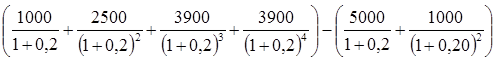 Решение: 1. Чистый доход ( чистая прибыль плюс амортизация), тыс. рублей: Первый год- 800+200= 1000, Второй год- 400+2100= 2500, Третий год- 3500 + 400 = 3900, Четвёртый год – 3500+ 400 = 3900. 2. Интегральный эффект, тыс. рублей: ЧДД=