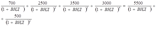 3. Индекс доходности, единицы: ИД= 6706\ 4871 = 1,38 2.4. Внутренняя норма доходности Внутренняя норма доходности (ВИД) является наиболее сложным показателем оценки эффективности инвестиционных проектов и представляет собой ту норму дисконта , при которой величина приведенных эффектов равна приведенным капиталовложениям. Таким образом, ВНД определяется решением уравнения: Если расчет ЧДД инвестиционного проекта дает ответ на вопрос, является он эффективным или нет при некоторой заданной норме дисконта, то ВНД проекта определяется в процессе расчета и затем сравнивается с требуемой инвестором нормой дохода на вкладываемый капитал. В ситуации, когда ВНД равна или больше требуемой инвестором нормы дохода на капитал, инвестиции в данный инвестиционный проект оправданны. В противном случае инвестиции в инвестиционный проект нецелесообразны и такой проект должен быть отвергнут предпринимательской фирмой. Если сравнение альтернативных инвестиционных проектов по ЧДД и ВНД приводит к противоположным результатам, предпочтение следует отдать ЧДД. Пример 2: Определить ВНД инвестиционного проекта и целесообразность его финансирования при норме дисконта 0,3.