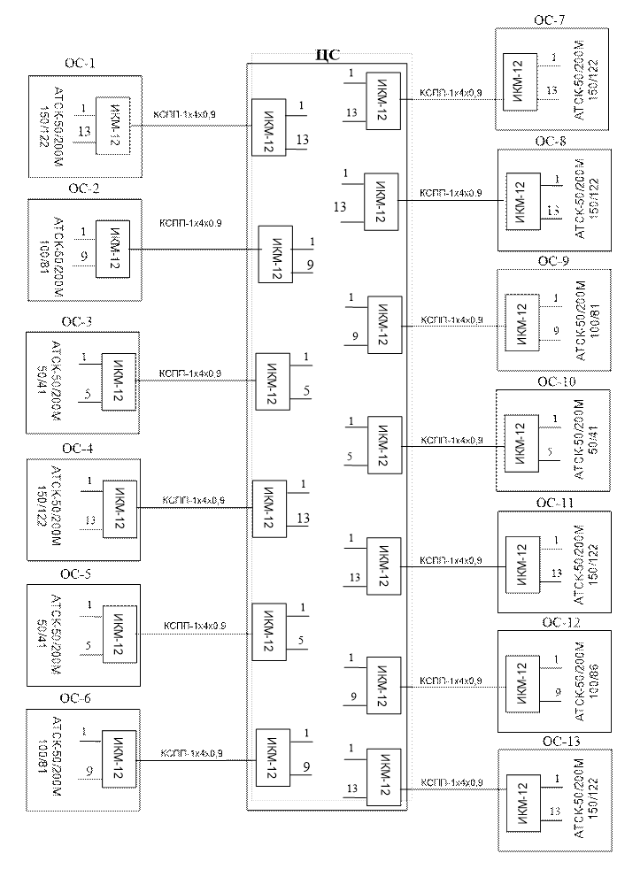 Примечание : на участках АТС-1 – ЦС и АТС-2 – ЦС используются многопарные кабели. Затухание на данных участках составляет 2,5 дБ и 3,5 дБ соответственно, что не превышает норму в 4,3 дБ. Количество необслуживаемых УС рассчитано с учетом расстояния между ОС и ЦС и того, что максимальное расстояние между необслуживаемыми промежуточными усилительными станциями для аппаратуры ИКМ-12М (ИКМ-15) составляет 7,2 км, а расстояние между необслуживаемыми регенерационными пунктами для аппаратуры ИКМ-30С составляет 4 км. Радиально-узловой способ.