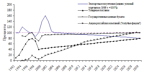 Основные положения долговой политики на 2007 – 2009 гг. включали в себя новейшие технологические подходы к решению долговых проблем, присущие мировому долговому менеджменту. Правительство включило долговую политику наряду с трехлетним финансовым планом и налоговой стратегией в число обязательных элементов бюджетного процесса, т. е. показатели долговой политики теперь утверждаются наряду с доходами и расходами федерального бюджета, а финансирование расходов по обслуживанию государственного долга должно быть по замыслу Минфина России увязано с достижением определенных долговых показателей: снижением его размера по отношению к ВВП, замещением внешнего долга внутренним, сокращением нерыночной части долга (именно поэтому основное внимание правительства было сосредоточено на досрочной выплате долга Парижскому клубу кредиторов – неторгуемого и дорогостоящего долга). В частности, проект долговой политики 2007 – 2009 гг. предусматривал снизить объем государственного долга с 16,8 до 12,4% ВВП. Но в результате проведенных переговоров с кредиторами Россия уже в 2006 г. погасила весь долг Парижскому клубу кредиторов, снизив отношение государственного долга к ВВП до 9%. Такие прогрессивные изменения в российской долговой политике, наряду с позитивной динамикой долговых коэффициентов, дали основание для более высокой оценки политических и экономических изменений в России международными рейтинговыми агентствами, присвоивших России инвестиционный рейтинг кредитоспособности. В заключении - Россия продолжает сокращать объем государственного внешнего долга. За 9 месяцев этого года он снизился еще на 9%, до 47-ми млрд долларов. Причем больше половины из этой суммы приходится на еврооблигации, выпущенные российским правительством. По абсолютным цифрам российский внешний госдолг – один из самых низких в Европе. А по относительным показателям – самый низкий, составляя лишь 8% от объема ВВП. Для сравнения – после кризиса 98-го года, внешний долг составлял почти 100% ВВП. Рост сырьевых цен значительно способствовал погашению внешнего долга. О сегодняшней ситуации с государственными долгами говорит бывший министр экономики России, а ныне президент банка «Российская финансовая корпорация» Андрей Нечаев: «Благоприятная бюджетная ситуация, гигантские резервы Центрального банка, который вышел, напомню, на 3-м месте в мире по золотовалютным резервам, превышающим сейчас 430 млрд долларов, большой Стабилизационный фонд – все это дает возможность России как государству практически полностью погасить свои долги хоть завтра. Другое дело, что на это не всегда соглашаются наши кредиторы, поэтому бывают долгие и непростые переговоры. Ведь мы экономим на будущих процентах, они свои будущие проценты теряют. Но, тем не менее, с Парижским клубом уже удалось договориться и полностью погасить ему долги. Сейчас, видимо, мы вступим в стадию активных переговоров со Всемирным банком по погашению долгов, хотя эти долги не так велики, и мы можем рассчитаться по ним в любую минуту». График 4. Относительные цены альтернативных средств платежа по внешнему долгу России в 1992–2030 гг. (1992-2007 гг. – факт, 2007–2030 гг. – прогноз)