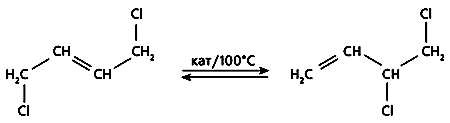 Рис.2. Изомеризация дихлорбутена. В поисках новых катализаторов мы обратились к металлорганосилоксанам (МОС) - олигомерам (молекулярная масса 1500-2000), содержащим группировки –RSi–O–M–О–RSi–O–. По существу, МОС представляют собой металлосиликаты, которые обрамлены органическими группами [2]. Они эффективны в качестве катализаторов крекинга (Al, Zr-содержащие МОС), дегидратации спиртов (Mg-содержащие), галогенирования и селективного окисления углеводородов (Fe-содержащие). Каталитический центр любых металлорганосилоксанов - ион металла, находящийся в силоксановом окружении. Для изомеризации такие катализаторы ранее не применяли. Нас они привлекли тем, что в процессе синтеза в их структуру можно вводить разные атомы металлов, плавно регулируя атомное соотношение M/Si. Кроме того, МОС растворимы в ацетоне, толуоле, спиртах, следовательно, пригодны как для гомогенного, так и гетерогенного катализа. Естественно, мы опробовали оба варианта. Для исследования каталитической активности мы, казалось бы, должны следить за превращением симметричного продукта галогенирования (1,4-ДХБ) в целевое несимметричное соединение. Однако он для кинетических измерений не годится, потому что существует в виде цис- и транс-стереоизомеров, которые изомеризуются с несколько различающимися скоростями. В результате возникает необходимость следить за изменением концентрации двух веществ одновременно, что экспериментально сложнее и к тому же снижает точность измерений. Конечный продукт 3,4-ДХБ, в отличие от исходного, не образует стереоизомеров, мы этим воспользовались и стали измерять не то, что нужно, а то, что удобно. Изомеризация - равновесная реакция (см. рис.2), следовательно, можно наблюдать не за прямым процессом, а за обратным, взяв в качестве исходного несимметричное соединение 3,4-ДХБ. Равновесие приведет в итоге к тому же соотношению компонентов реакции, что и прямой процесс. Катализатор не может сдвинуть равновесие: если в его присутствии увеличивается скорость прямой реакции, то возрастает и скорость обратной. Таким образом, задача катализатора - ускорить обе реакции, т.е. сократить время, которое необходимо для достижения равновесия. Далее задача решалась чисто технически. После того как достигалось равновесие, из реакционной смеси отгоняли несимметричный продукт (он кипит при более низкой температуре), а в остатке вновь восстанавливалась его равновесная концентрация в полном соответствии с законом действующих масс. Чем быстрее достигается равновесие, тем эффективнее процесс и, следовательно, тем лучше работает катализатор. Выбранные нами металлорганосилоксаны, ранее не изучавшиеся в процессах такого типа, оправдали возлагаемые на них надежды. Для гомогенного катализа были выбраны МОС с тем металлом, который используют в традиционных катализаторах, т.е. медь. Активность Cu-содержащих соединений с фенильной группой у кремния оказалась весьма высокой: конверсия в течение 80 мин достигала 75%, однако при большем времени работы металлорганосилоксан выпадал в осадок, образующийся из-за межмолекулярных сшивок [3]. В связи с этим мы стали ориентироваться на более устойчивые формы катализаторов, полученных нанесением МОС на поверхность силикагеля. Катализатор закреплялся на поверхности минерального носителя благодаря взаимодействию при повышенно