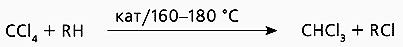 Рис.3. Обменное галогенирование CCl4 с углеводородом. В ходе изучения процесса мы выяснили, что так же, как в рассмотренной только что изомеризации, увеличение количества катализатора не дает существенного выигрыша в конверсии. Чтобы детальнее исследовать это явление, мы оценили активность катализатора как конверсию, приходящуюся на один моль меди [6]. Оказалось, что максимальной активность бывает при весьма низком содержании каталитических центров на носителе - до 0.1%. Это нельзя было объяснить тем, что часть их находится в глубинных слоях катализатора и потому не участвует в катализе. Причины обнаружились при изучении особенностей строения самого катализатора. В двух упомянутых катализаторах - комплексе галогенида меди и медьсодержащем фенилсилоксане - координационные сферы иона меди (т.е. атомы, окружающие Cu) различаются. Следовательно, сравнив работу этих катализаторов в обменном галогенировании, можно выяснить некоторые детали каталитического механизма. A priori возможны три варианта: - радикально-цепной механизм (с участием ионов меди переменной валентности); - окислительное присоединение CCl4 к металлическому центру, протекающее в координационной сфере металла; - стабилизация радикала ·CCl3 в координационной сфере металла. Чтобы понять, какой именно вариант действует, мы исследовали поведение двух этих катализаторов при совместном хлорировании трех пар углеводородов [5]: