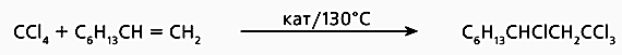 Рис. 5. Каталитическое присоединение CCl4 к олефину. Каталитическое обменное галогенирование в этом случае протекает тоже по радикальной схеме, но с некоторым отличием: при участии двойной связи олефина радикальный центр образуется легче. Факт вполне ожидаемый; радикальная полимеризация олефиновых мономеров именно поэтому столь широко распространена. Так же, как в предыдущих двух процессах, катализатор сохранял стабильность каталитических свойств при многократном использовании [8]. Интересно, что вновь подтвердилась уже отмеченная особенность: катализатор проявляет максимальную активность (определяемую как конверсия, приходящаяся на один каталитический центр) при очень малом его содержании на носителе - до 0.2% меди. Очевидно, что прослеживается закономерность, и она требует объяснения. Итак, большая часть атомов меди почему-то “выключена” из катализа. Нам удалось обнаружить причину этого с помощью магнитных измерений и спектральных исследований исходных металлорганосилоксанов. Выяснилось, что значительная часть атомов металла связана в межцепные координационные кластеры [2] (рис.6). Металл стремится заполнить свою координационную сферу, привлекая атомы кислорода соседних фрагментов –Si–O–M–, а оказавшись координационно-насыщенным, с трудом взаимодействует с реагентом CCl4.