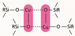 Рис. 6. Координационные межцепные кластеры в металлорганосилоксанах. Как предотвратить образование межцепных кластеров? Можно, например, “укрыть” металл каким-либо лигандом. Это, безусловно, затормозит межцепную координацию, но не поможет решить основную задачу, поскольку лиганд в свою очередь затруднит приближение реагента. Тем не менее мы справились с ней, когда привлекли к участию органическую группу, связав ее с кремнием. Жесткая и мало подвижная фенильная группа, обрамляющая кремний в исследованных металлорганосилоксанах, не может препятствовать координационному взаимодействию атомов меди в соседних цепях. Если заменить фенильную группу на нонильную, ситуация меняется (рис.7). Объемистая алифатическая группа будто “окутывает” металлические центры и потому эффективно предотвращает координационное взаимодействие атомов меди в соседних цепях. Но в реакционной среде эта группа обладает подвижностью полимерного сегмента и не препятствует приближению органического реагента к каталитическому центру. Таким образом, четыреххлористый углерод как бы отодвигает нонильную группу, чего не может сделать атом меди соседней цепи.