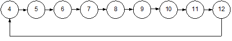 Параметры элементов УУ : - Тип счётчика (СТ) Синхронный с параллельным переносом - Направление счёта СТ +1 - Начальное состояние СТ Анач. = 4 - Модуль счёта Ксч. = 9 - Тип триггеров для реализации СТ 7472 - Тип дешифратора DC состояний счётчика DC 4 - Выходной код DC унитарный - Тип логики, задаваемый для реализации схемы ТТЛ - Управляемый генератор (G) интегральный таймер - На базе ИМС LM555CN-8 (1006BИ1) Параметры управляющих сигналов: - Длительность 0,1с - Период повторения 0,2с - Скважность 2 - Амплитуда управляющего сигнала уровень ТТЛ Индикация: - Выходных состояний СТ цифровая (шестнадцатеричный код) - Управляющих сигналов светодиоды - Источник запуска Word Generator - Режим запуска Step by step Синтез синхронного счётчикаПо заданным исходным данным осуществим синтез синхронного счётчика (СТ), реализующего требуемую последовательность внутренних состояний УУ: · Данный счётчик является суммирующим, производя счёт из состояния 4 девять отсчётов. Составим линейный граф выходных состояний: