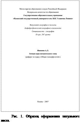 Титульный лист оформляется так, как показано на рисунке 1. В оглавлении, которое идет вслед за титульным листом, воспроизводится рубрикация, соответствующая тексту реферата, с обязательным указанием номеров страниц разделов. Все страницы реферата имеют порядковый номер, который проставляется вверху посередине листа; на титульном листе номер страницы не ставится.