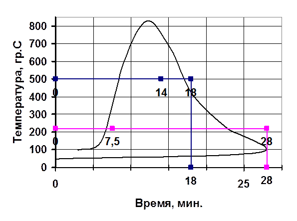 При t= 3 мин Т= 150 °С При t= 6,1 мин Т= 603,5 °С При t= 9,1мин Т= 828 °С При t= 12,1 мин Т= 676,6 °С При t= 15,2 мин Т= 411,7 °С При t= 18,2 мин Т= 221,2 °С При t= 22,75 мин Т= 86,45 °С При t= 27,3 мин Т= 48 °С 3.1.3. График температурного режима при пожаре в помещении Строим графиктемпературного режима при пожаре в помещении на характерных интервалах времени: