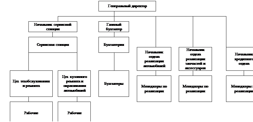 Рис.2. Организационная структура управления автосалона «Тойота Центр Сургут» Такая организационная структура образуется в результате построения аппарата управления из взаимоподчинённых органов в виде иерархической лестницы, т.е. каждый подчинённый имеет одного руководителя, а руководитель имеет несколько подчинённых. Возглавляет деятельность и осуществляет непосредственное руководство автосалоном генеральный директор, в непосредственном подчинении которого находятся начальник сервисной станции, главный бухгалтер и начальник отдела реализации запчастей и аксессуаров, начальник отдела реализации автомобилей и начальник кредитного отдела. Начальник сервисной станции осуществляет руководство двумя структурными подразделениями: цеха техобслуживания и ремонта, цех кузовного ремонта и окрашивания автомобилей. В данных структурных подразделениях осуществляется техническое сопровождение реализуемых автомобилей и оказание коммерческих услуг по техническому обслуживанию. Начальник отдела реализации запчастей и аксессуаров координирует деятельность отдела, основной функцией отдела является продажа указанной продукции предприятия. Начальник отдела по реализации автомобилей осуществляет руководство отделом и отвечает за маркетинговую политику предприятия во взаимодействии с генеральным директором предприятия. Начальник кредитного отдела осуществляет руководство отделом и отвечает за кредитную политику предприятия во взаимодействии с генеральным директором. Главный бухгалтер отвечает за финансовую политику предприятия во взаимодействии с генеральным директором. К преимуществам данной структуры управления относятся: - простое построение; - однозначное ограничение задач, компетенции, ответственности; - жесткое руководство органами управления; - оперативность и точность управленческих решений; - сокращение звеньев согласования; - уменьшение дублирования работ; - укрепление вертикальных связей и усиление контроля за деятельностью нижестоящих уровней; - высокая компетентность специалистов, отвечающих за выполнение конкретных функций. Основные принципы построения организационной структуры автосалона «Тойота Центр Сургут»: Гибкость - характеризует способность быстрой перестройки в соответствии с изменениями, происходящими в персонале и на производстве. Централизация - заключается в разумной централизации функций работников на предприятии с передачей в нижнее звено функции оперативного управления. Специализация - обеспечивает за каждым работником определенные функции управления. Нормоуправляемость - это соблюдение рационального числа подчиненных у каждого руководителя. Единство прав и ответственностей - означает, что права и ответственность подразделений и сотрудников находятся в диалектическом единстве. Экономичность - характеризует достижением минимально необходимых затрат на построение и содержание организационной структуры управления. 3. Характеристика выполняемых работ и оказываемых услуг Деятельность компании «Тойота Центр Сургут» ведется по следующим направлениям: 1. Продажа автомобилей Toyota и их предпродажная подготовка; 2. Продажа автомобилей Toyota в кредит и лизинг. Данная услуга дает возможность купить автомобиль в кредит, помогает сэкономить время, деньги и найти на рынк