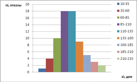Рисунок 2 – гистограмма распределения отказов изделия во времени. Сделаем предположение, что закон распределения случайной величины – нормальный. Для подтверждения данного предположения рассчитаем числовые характеристики случайной величины: а) математическое ожидание: где Хi – середины интервалов времени; ni - количество отказов в соответствующих интервалах времени; n – общее количество отказов. n=70;