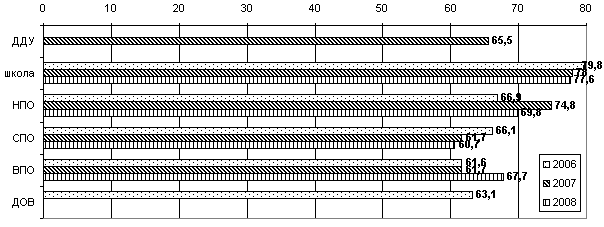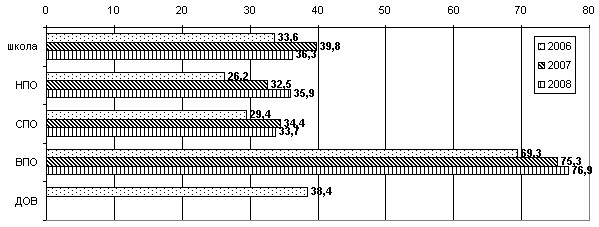 Более 60% преподавателей на каждом образовательном уровне в течение последних трех лет проходили процесс повышения квалификации в той или иной форме. Чаще всего это прохождение обучения по программам повышения квалификации, прежде всего касающееся учителей школ (73,2% в 2006 г., 73,9% в 2008 г.), преподавателей системы НПО (63,3 и 62,6% соответственно), воспитателей детских садов (66,7% в 2007 г.). Существенно реже преподаватели разных уровней участвуют в стажировках (чаще всего — преподаватели вузов, 20,4% в 2006 г. и 23,3% в 2008 г.), в летних и т.п. выездных школах и семинарах (чаще всего — учителя школ, 22,5% в 2006 и 18.5% в 2008), в поездках и стажировках в рамках научного обмена и обмена преподавателями (чаще всего — преподаватели вузов, 7,9 и 8.9% соответственно), в магистерских программах и аспирантуре (чаще всего — преподаватели вузов, 14,5% в 2006 и 15,1% в 2008 г.). В целом в динамике участие преподавателей в различных формах повышения квалификации по большинству уровней образования несколько снизилось (школы, СПО), и лишь в системе ВПО наблюдался рост.