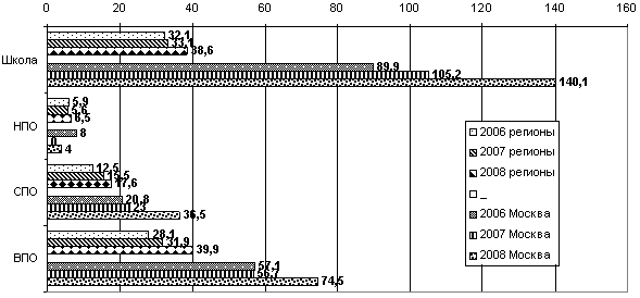 По всем категориям преподавателей в целом доля занимающихся научной работой за 2 года выросла. Чаще всего ведут научные исследования преподаватели вузов (69,3% в 2006 г и 76,9% в 2008 г.), на остальных уровнях образования эта доля не превышает 40%. Занятость научными разработками выросла среди школьных учителей с 33.6% до 36,3%, преподавателей СПО — с 29,4 до 33,7%, НПО — с 26,2 до 35,9%. Учащиеся Рис. 3. Стоимость одного года обучения для учащихся, обучающихся на платной основе, тыс.руб.