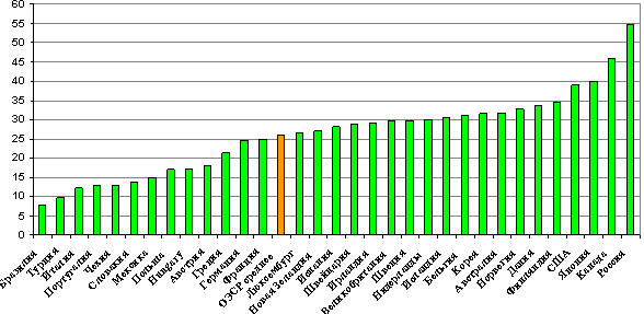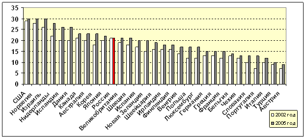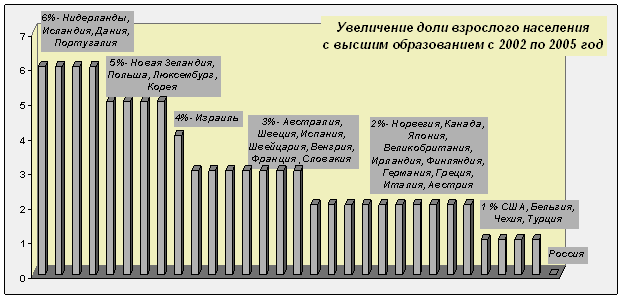 Доля взрослого населения с законченным высшим образованием Как видим (табл.3), лидирующие позиции по уровню образования взрослого населения занимают три страны - США, Норвегия, Израиль, в которых 30% населения в возрасте 25-64 года имеют законченное высшее образование. Россия, занимавшая в 2002 году 7-е место, в 2005 году уступила свои позиции еще четырем странам, разделив 11-13-е места с Великобританией и Швецией. В подавляющем числе рассматриваемых стран в 2005 году отмечается положительная динамика по сравнению с 2002 годом (рис.5).