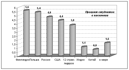 Рис. 11. Процентное соотношение долей взрослого населения с законченным образованием уровня 5А/6 (высшим и послевузовским по российской классификации) и третичным образованием всех уровней (включая 5В – среднее профессиональное по российской классификации) * в сопоставлении с соотношением долей студентов на уровне 5А/6 и в третичном образовании всех уровней. В целом, несмотря на отмеченные диспропорции в российском третичном образовании, приведенные выше данные, безусловно, свидетельствует об очень высоком уровне образования населения России. Позиции ведущих стран по результатам международных рейтингов Помимо группы стран, отобранных по совокупности четырех количественных критериев, безусловный интерес представляют национальные образовательные системы, лидирующие хотя бы в одной из следующих областей: · Экспорт образовательных услуг как отражение сложившейся репутации национальной системы образования в международном сообществе; · Международные рейтинги университетов мира, позволяющие оценить национальную систему высшего образования по составляющим ее университетам; · Международное исследование качества обучения PISA (Programme for International Student Assessment) - состояние обучения на уровне средней школы, являющейся фундаментом вузовского образования; · Доступность высшего образования и финансовые возможности его получения; · Масштабы дистанционного образования; При рассмотрении перечисленных областей становится очевидным, что лидирующие позиции в них в основном принадлежат странам с высоким уровнем охвата населения высшим образованием и высоким индексом образования. Исключение составляют Индия и Китай, выступающие на первый план не только по количеству студентов в высшем образовании, но и уверенно лидирующие в динамике роста студентов и в развитии дистанционного образования. К 12 странам-лидерам, отобранным с учетом фактора масштаба, помимо Индии и Китая, добавляются всего две страны: Финляндия, лидирующая в трех рейтингах: 1) качество школьного обучения PISA – 2006, 2) финансовые возможности получения высшего образования, 3) доступность высшего образования (2-е место); Швеция – лидер рейтинга по финансовым возможностям получения высшего образования. Таким образом, по совокупности рассмотренных показателей представляется целесообразным выделить следующую группу ведущих стран в сфере образования: Австралия, Великобритания, Германия, Индия, Испания, Канада, Корея, Китай, Нидерланды, Польша, Россия, США, Финляндия, Франция, Швеция, Япония. Из этой группы стран наиболее высокие показатели уровня образования населения имеют: · индекс образования - Австралия, Испания, Канада, Финляндия (индекс образования 0,99); · доля взрослого населения с высшим образованием (МСКО 5А/6) – США (30%), Нидерланды (28%), Канада, Австралия, Корея (23%); · количество студентов вузов (МСКО 5А/6) - США (13,2 млн.), Индия (11,8 млн.), Китай (10,8 млн.), Россия (6,9 млн.); · доля студентов вузов (МСКО 5А/6) в населении страны: с учетом фактора масштаба – Польша (5,4% при количестве студентов 2 млн.), Россия (4,8% при количестве студентов 6,9 млн.), США (4,4% при количестве студентов 13,2 млн.); без учета фактора масштаба – Финляндия (5,6% при количестве студентов 0,3 млн.); · доля взрослого населения с третичным образованием – Россия (54,6%), Канада (44,6%), США (39,1%). В международных рейтингах в области образован