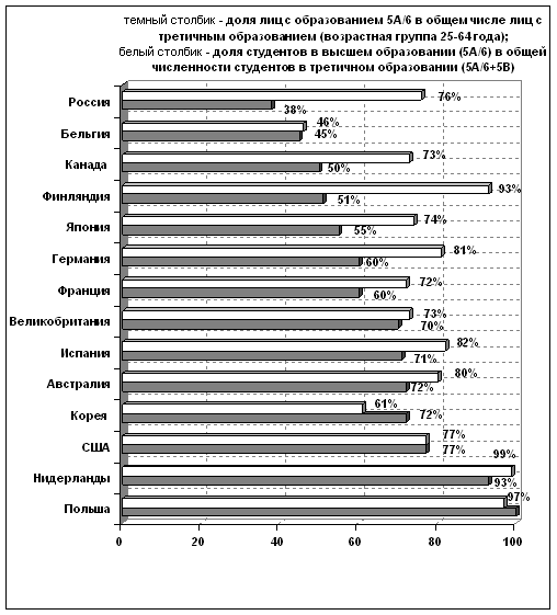 б) Рис. 10. Доля лиц в населении возрастной группы 25-64 года, имеющих третичное образование, % (по данным табл.) а) МСКО 5А/6 (суммарно высшее и послевузовское образование) – белый столбик, МСКО 5В/5А/6 (суммарно все уровни) - темный столбик; б) МСКО 5А/6– белый столбик, МСКО 5В (среднее профессиональное по российской классификации) - темный столбик В свете изложенного важным показателем, характеризующим развитие российской образовательной системы, следует считать соотношение количества студентов вузов и средних профессиональных учебных заведений. Динамика изменения этого показателя в течение последних 15 лет свидетельствует о процессе выравнивания диспропорций в развитии российского образования. Процент студентов российских вузов (уровень 5А) в общем количестве студентов в третичном образовании в 2005 г. составил 76%. Это вполне соответствует современному уровню ведущих стран (например, в США этот показатель в 2005 г. составил 77%, в Великобритании– 73%, в Канаде – 73%, во Франции – 72%). Аналогичное соотношение долей взрослого населения с образованием 5А/6 и ко всему третичному (5А/6+5В) в том же году составило всего 38% (табл.5). Как видно из гистограммы на рис.11, не только в России, но и в ряде других стран отмечается тенденция к увеличению доли лиц с образованием 5А/6 в общем числе лиц с третичным образованием за счет высокого процента студентов уровня 5А/6 в общем числе студентов. Наиболее яркие примеры помимо России – Финляндия, Канада, Германия; исключение – Бельгия, в которой каждый из рассматриваемых показателей составляет менее 50%.