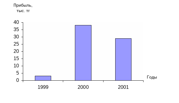Доходность хозяйствующего субъекта определяется в абсолютных и относительных величинах. Абсолютный показатель доходности – это сумма прибыли, относительный – рентабельность. Основными факторами, влияющими на размер чистой прибыли, являются объем выручки от реализации продукции, уровень себестоимости, уровень рентабельности, величина налогов, уплачиваемых из прибыли. Изменение величины прибыли за период 1999 – 2001 гг. представлено рисунком 1.2.1 На рисунке 1.2.1 показано, что в 1999 году полученная предприятием прибыль составила 3226 тыс. тенге, при объеме выполненных работ на сумму 15728 тыс. тенге и себестоимости – 12507,37 тыс. тенге. В 2000 году, в связи с ростом объема выполненных работ прибыль составила 38964,89тыс. тенге. В 2001 году наблюдается уменьшение прибыли до 28892,73 тыс. тенге.