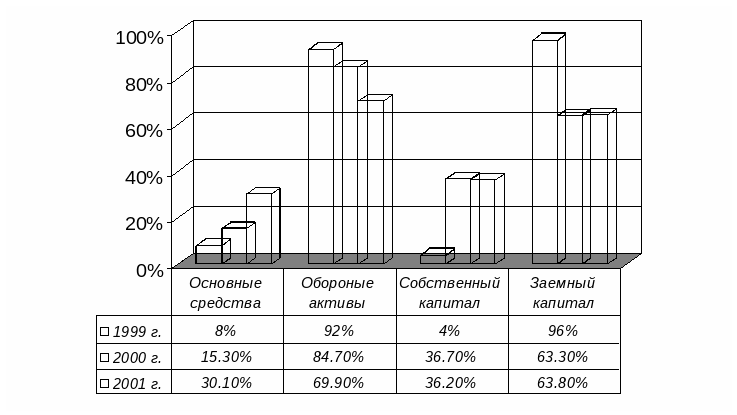 Рисунок 3.1.1 – График структуры имущества предприятия Из таблицы видно, в 2000 году по сравнению с 1999 произошло увеличение активов предприятия на 123710 тыс. тенге, а в 2001 году – на 27874 тыс. тенге, то есть на 19,8%. Увеличение активов происходит за счет снижения дебиторской задолженности на 2,3% что в денежном выражении составляет 1887 тыс.тенге, за счет увеличения запасов – на 581 тыс. тенге, денежных средств – 86 тыс. тенге. Доля иммобилизованных активов, в структуре активов увеличилась на 14,8% и к концу года составила 58,4%, удельный вес оборотных средств наоборот уменьшился на 14,8%. Пассив баланса характеризуется преобладающим удельным весом заемного капитала, хотя и наблюдается тенденция к его снижению. Доля заемного капитала составила в 1999 году – 96%, в 2000 году – 63,3%, в 2001 году – 63,8%. Доля собственного капитала в 2000 году выросла на 50931,1 тыс. тенге, а в 2001 году на 9256 тыс. тенге, его доля в источниках средств составила 36,2%. Для более глубокой оценки финансового состояния предприятия необходимо использовать целый ряд дополнительных показателей, сгруппированных следующим образом: Показатели ликвидности; Показатели структуры капитала и оборотных средств или финансовой устойчивости; Показатели эффективности производства;Специально для расчета составлена аналитическая таблица баланса, которая представляет собой свернутую форму балансовой отчетности, таблица о финансовых результатах работы предприятия, среднегодовые величины показателей за 1999 - 2001 гг. Расчет некоторых коэффициентов проводится для сравнения изменения показателей в динамике. 3.2 Анализ абсолютных показателей финансовой устойчивости Абсолютными показателями финансовой устойчивости являются показатели, характеризующие степень обеспеченности товарно-материальных запасов источниками их формирования. Для характеристики источников формирования товарно-материальных запасов определяют три основных показателя. Наличие собственного оборотного капитала. Он характеризует собственные оборотные средства, его увеличение по сравнению с предыдущим периодом свидетельствует о дальнейшем развитии деятельности предприятия. Этот показатель определяется по формуле: Со.к.= Ск – Да = Iр.П – Iр.А, (3.2.1) где Ск – собственный капитал, тыс. тенге; Да – долгосрочные активы, тыс. тенге; Iр.П – первый раздел пассива баланса; Iр.А – первый раздел актива баланса. Наличие собственных и долгосрочных заемных источников формирования товарно-материальных запасов. Он определяется путем увеличения предыдущего показателя, т.е. собственного оборотного капитала на сумму долгосрочных обязательств по формуле: Сок/д= Со.к+До, (3.2.2) где До – долгосрочные обязательства. Общая величина основных источников формирования товарно-материальных запасов определяется по формуле: ОИ= Сок/д+Кк, (3.2.3) где Кк – краткосрочные кредиты и займы. Трем показателям наличия источников формирования товарно-материальных запасов и затрат соответствуют три показателя обеспеченности товарно-материальных запасов и затрат источниками их формирования: Излишек или недостаток собственного оборотного капитала: Со.к.= Со.к.-З, (3.2.4) где З – товарно-материальные запасы и затраты. Излишек или недостаток собственных и долгосрочных источников формирования товарно-материальных запасов: Сок/д= Сок/д-З, (3.2.5) Излишек или недостаток общей величины основ