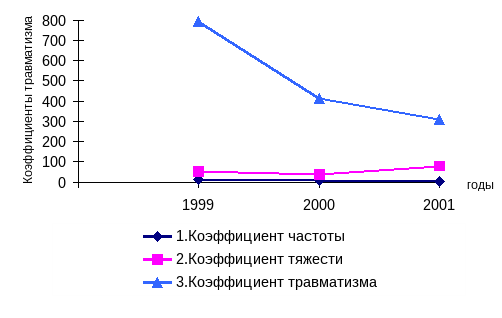 1 Определим коэффициент частоты: Кч= где Т –- количество несчастных случаев; Р – среднесписочная численность. Кч1999 = 13,7 Кч2000 = 11,63 Кч2001 = 3,91 2 Определим коэффициент тяжести: К= где Д - число дней нетрудоспособности. К1999=54 К2000=38 К2001=79 3 Определим общий коэффициент травматизма: Ко= Ко1999 =793,8 Ко2000 =411,94 Ко2001 =308,89 Из определения этих коэффициентов можно сделать вывод, что наибольшее число травм приходится на 1999г. (Кч=13,7), наибольший коэффициент тяжести приходится на 2001г. (К=79). Результаты расчетов сведем в таблицу 4.1.2, а на рисунке 4.1.1 построим график по этим данным. Таблица 4.1.2 - Динамика коэффициентов травматизма