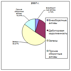 Рисунок 1. Соотношение основных групп активов в 2007 и 2008 гг. Рост величины активов организации в 2007 г. связан, в основном, с ростом следующих позиций актива баланса (в скобках указана доля изменения данной статьи в общей сумме всех положительно изменившихся статей): · денежные средства - 2 298 тыс. руб. (39,1%), · дебиторская задолженность (платежи по которой ожидаются в течение 12 месяцев после отчетной даты): покупатели и заказчики – 1 477 тыс. руб. (25,1%) · дебиторская задолженность (платежи по которой ожидаются в течение 12 месяцев после отчетной даты) – 944 тыс. руб. (16%) запасы: готовая продукция и товары для перепродажи – 801 тыс. руб. (13,6%) Одновременно, в пассиве баланса прирост наблюдается по строкам: · нераспределенная прибыль (непокрытый убыток) – 3 308 тыс. руб. (80,2%) кредиторская задолженность: поставщики и подрядчики – 819 тыс. руб. (19,8%). Среди отрицательно изменившихся статей баланса в 2007 г. можно выделить "налог на добавленную стоимость по приобретенным ценностям" в активе и "кредиторская задолженность: прочие кредиторы" в пассиве (-2 027 тыс. руб. и -1 276 тыс. руб. соответственно). Снижение величины активов в 2008 г. связано, главным образом, со снижением следующих позиций актива баланса (в скобках указана доля изменения данной статьи в общей сумме всех отрицательно изменившихся статей): · запасы: готовая продукция и товары для перепродажи – 7 413 тыс. руб. (49,6%) · дебиторская задолженность (платежи по которой ожидаются в течение 12 месяцев после отчетной даты): покупатели и заказчики – 3 959 тыс. руб. (26,5%) · дебиторская задолженность (платежи по которой ожидаются в течение 12 месяцев после отчетной даты) – 3 571 тыс. руб. (23,9%) Одновременно, в пассиве баланса снижение произошло по строке "кредиторская задолженность: поставщики и подрядчики" (-4 537 тыс. руб., или 100% вклада в снижение пассивов организации за год). Среди положительно изменившихся статей баланса в 2008 г. можно выделить "денежные средства" в активе и "нераспределенная прибыль (непокрытый убыток)" в пассиве (+10 282 тыс. руб. и +2 455 тыс. руб. соответственно). Собственный капитал ООО «Амкор-Электроникс» в течение 2007 г. вырос c 11 312,0 тыс. руб. до 14 620,0 тыс. руб. (т.е. на 3 308,0 тыс. руб., или на 29,2%), а за 2008 г. - до 17 075,0 тыс. руб. (т.е. +2 455,0 тыс. руб. или на 16,79%). Подводя итог оценки балансовых данных можно заключить, что за отчетный период возросла валюта баланса, что свидетельствует о расширении бизнеса предприятием. У предприятия как на начало, так и на конец отчетного периода сумма собственных средств была больше величины внеоборотных активов, что свидетельствует о достаточности у него средств для финансирования текущей деятельности. В отчетном периоде заемные средства превышали собственные, это говорит о не совсем оптимальной структуре пассивов предприятия. 3. Оценка финансовой устойчивости предприятия Экономической сущностью финансовой устойчивости предприятия является обеспеченность необходимых ему запасов и затрат источниками их формирования. Анализ финансовой устойчивости предприятия базируется на исследовании соответствующей системы абсолютных и относительных показателей, в совокупности отражающих сущность устойчивости финансового состояния. Анализ финансовой устойчивости предприятия основывается на оценке величины и структуры актива и пассива бухгалтерского баланса. Для экспресс-оценки финансовой устойч