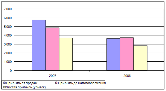 Из таблицы 2 видно, что размер чистой прибыли отчетного периода, результирующей величины, характеризующей финансовые результаты работы предприятия, свидетельствует о снижении эффективности финансово-хозяйственной деятельности предприятия. За анализируемый период она снизилась на 23,58% (на 874 тыс. руб.). В отчетном периоде размер чистой прибыли не зависел от каких-либо форс-мажорных обстоятельств, поэтому она по своей величине была равна прибыли от обычной деятельности. Прибыль до налогообложения в отчетном периоде снизилась на 23,60% (на 1 151 тыс. руб.), а прибыль от продаж, базовая характеристика результативности уставной деятельности пищекомбината, уменьшилась за тот же период на 36,89% (на 2 116 тыс. руб.). Графически прибыль ООО «Амкор-Электроникс» представлена на рис. 1.