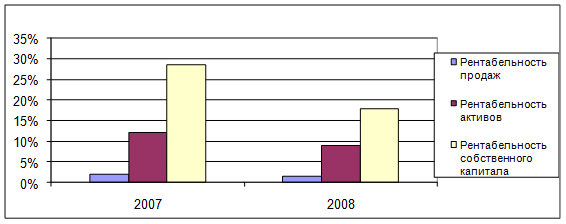 Рисунок 1. Прибыль предприятия. Обращает на себя внимание большая величина коммерческих и управленческих расходов на предприятии и их тенденция к росту. В их снижении заключен один из резервов повышения финансовых результатов деятельности предприятия. Валовая прибыль как исходный результирующий показатель представляет интерес в сравнении с показателем прибыли до налогообложения. В отчетном периоде показатель валовой прибыли превышал показатель прибыли до налогообложения в 6 раз, а в предыдущем периоде в 7,7 раз. Это говорит о том, что средства, дополнительно вкладываемые (или реинвестируемые) предприятием в иные, отличные от уставных, виды деятельности, в совокупности с коммерческими и управленческими расходами были меньше получаемых доходов. Рентабельность – это одна из базовых экономических категорий, являющаяся наряду с абсолютным размером прибыли показателем эффективности работы предприятия. Рентабельность продаж ( R прод) = (Чистая прибыль : Выручка от продаж) х 100% R прод (2007 г.) = (3 707 : 194 442) х 100% = 1,91% R прод (2008 г.) = (2 833 : 191395) х 100% = 1,48 % Вывод: за отчетный период предприятие стало получать на 0,43 коп прибыли с каждого рубля проданной продукции меньше, чем в прошлом году. Показатели рентабельности ООО «Амкор-Электроникс» наглядно представлены на рис. 2.
