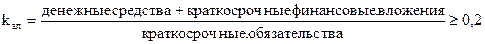 к3 = СП/РСК к3.1=49900/387056=0,13 к3.2=153256,64/403117,36=0,38 3.1.2. Анализ финансовой устойчивости Анализ финансовой устойчивости основывается на анализе наличия и достаточности реального собственного капитала, а также анализе обеспеченности запасов источниками их формирования. Для оценки финансовой устойчивости акционерных организаций используется показатель чистых активов ( ЧА ) , определяемый по формуле: ЧА = Активы к расчету - Обязательства к расчету = = (итог 1 и 2 разделов баланса - стоимость акций, выкупленных у акционеров - задолженность по вкладам в УК) - (итог 4 и 5 разделов баланса + целевое финансирование - ДБП) ЧА1 = (450970-14014)-(49900)=387056 ЧА2 = 556374-(101000+52756,64-500)=403117,36 Положительная разница характеризует прирост собственного капитала после образования организации, отрицательная – отвлечение собственного капитала. 3.1.3. Анализ платежеспособности и ликвидности Платежеспособность предприятия выступает в качестве внешнего проявления финансовой устойчивости, сущностью которого является обеспеченность оборотных активов долгосрочными источниками. · Коэффициент абсолютной ликвидности (кал ) показывает какую часть краткосрочной задолженности может покрыть организация за счет имеющихся денежных средств и краткосрочных финансовых вложений, быстро реализуемых в случае надобности:
