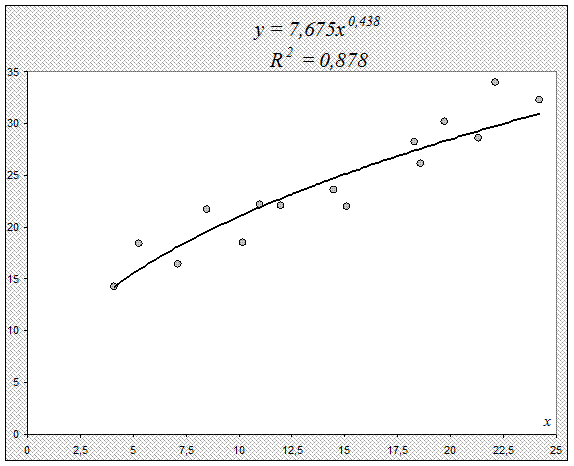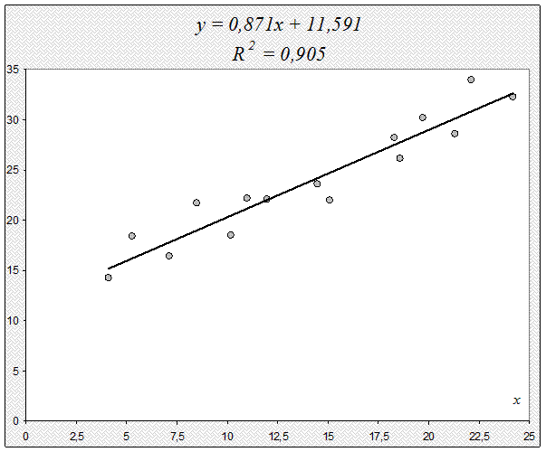 следовательно, гипотеза H 0 отвергается, принимается альтернативная гипотеза H 1 : с вероятностью 1-α=0,95 полученное уравнение статистически значимо, связь между переменными x и y неслучайна. Построим полученное уравнение.
