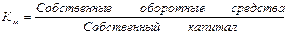 = Ка 2005 н.г. = 7/109 = 0,06 Ка 2005 к.г. = 135/600=0,23 Ка 2006 к.г. = 1445/12304 = 0,12 Ка 2007 к.г. = 1784/15187 = 0,12 Коэффициент автономии показывает долю средств собственника, вложенных в общую стоимость имущества предприятия. Как видно, значение этого коэффициента меняется на протяжении рассматриваемого периода от 0,06 до 0,23. В последний год значение коэффициента автономии стабилизировалось на уровне 0,12, то есть лишь 12% стоимости имущества предприятия – это доля средств учредителей, остальная часть финансируется за счет заемных средств. Этот коэффициент важен для кредиторов предприятия, так как определяет степень их риска на вложенный в предприятие капитал. Оптимальное значение коэффициента на уровне 0,5, у нас же значение гораздо ниже, то есть предприятие зависимо от кредиторов. Коэффициент обеспеченности собственными оборотными средствами
