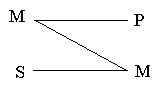 Правила 1-й фигуры: 1) бoльшая посылка должна быть общей (А или Е); 2) мeньшая посылка должна быть утвердительной (А или I). В фигуре 1 средний термин является подлежащим в большей посылке, сказуемым — в меньшей. Теперь мы возьмём 11 возможных сочетаний и предположим, что каждое сочетание изменяет положение среднего термина указанными четырьмя способами, тогда получится 44 сочетание. Рассмотрим, какие из них возможны. Чтобы показать, как производится такого рода исследование, возьмём для примера сочетание AEE, изобразим его по первой фигуре. А Все М суть Р. Е Ни одно S не есть М. E Ни одно S не есть Р. Если мы обратим внимание на термин Р, то окажется, что в большей посылке как сказуемое обще-утвердительного суждения он не распределён, между тем в заключении как сказуемое обще-отрицательного суждения он распределён. Это противоречит правилу 4 (Термины, не взятые в посылках во всём объёме, не могут быть и в заключении взяты во всём объёме.), а следовательно, такое сочетание невозможно.