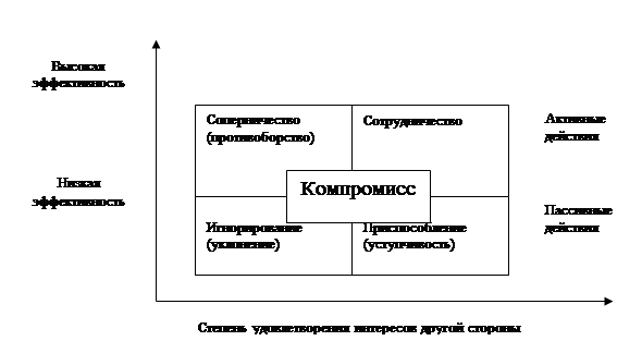 Рис. 3. Стратегия поведения руководителя при разрешении межличностных конфликтов Согласно матрицы в конфликтной ситуации возможны пять основных стилей поведения. Соперничество (противоборство) характеризуется активными действиями руководителя по пресечению конфликта с использование всех доступных средств и приемов. Этот стиль может быть эффективным, если руководитель имеет значительную власть над подчиненными. Недостаток его в том, что причины конфликта при этом не исчезают, и он переходит в скрытую форму. Сотрудничество означает действия, направленные на поиск решения, удовлетворяющего всех участников конфликта. Предполагает открытый обмен мнениями, направленный на поиск точек соприкосновения, которые могут стать основой для выработки решения устраивающего конфликтующие стороны и руководства коллектива. Игнорирование (уклонение) предполагает стиль поведения руководителя, при котором он уходит от существа конфликта, не хочет брать на себя ответственность за его решение, не придает значения спорам и разногласиям, отрицает наличие конфликта. Такое поведение обычно используется руководителем, если конфликт не особенно значим, если важнее для него сохранить хорошие отношения с оппонентами. Приспособление (уступчивость) применяется руководителями, не имеющими большого авторитета в коллективе, или если они хотят сохранить благоприятные отношения с обеими, участвующими в конфликте сторонами, зачастую за счет ущемления собственных интересов. Выбор стратегии компромисса наиболее эффективный стиль действия руководителя в конфликтной ситуации. Его действия направлены на поиска решения спорных проблем путем взаимных уступок, нахождения варианта, устраивающего обе стороны конфликта, но и что очень важно интересов руководства. Способность найти компромисс в конфликтной ситуации высоко характеризует руководителя, так как это позволяет быстро разрешить конфликт, сохранив при этом хороший социально-психологический климат в коллективе. Для этого ему требуются не только авторитет в коллективе, но и искусство работы с людьми. Наряду с использованием различных стратегий поведения руководителя в конфликтной ситуации, важно знать методику разрешения конфликта. Она предполагает определенную последовательность действий для достижения желаемых результатов: 1) признать наличие конфликта и глубоко его изучить; 2) преобразовать существо проблемы в категорию целей, а не решений; 3) сосредоточить внимание на проблеме, а не личном отношении к конфликтующим сторонам; 4) создать атмосферу доверия, увеличив влияние на взаимный обмен информацией; 5) определить возможные варианты решения проблемы; 6) принять согласованное решение после рассмотрения всех возможных вариантов решения; 7) реализовать принятое решение на практике. ЛИТЕРАТУРА 1. Мазур И.И., Шапиро В.Д., Ольдерогге. Эффективный менеджмент/ Под ред. И.И.Мазура. – М.: Высшая школа, 2003. – 554 с. 2. Мескон М.Х., Альберт М., Хедоури Ф. Основы менеджмента/ Пер. с англ. – М.: Дело, 2005. – 702 с. |