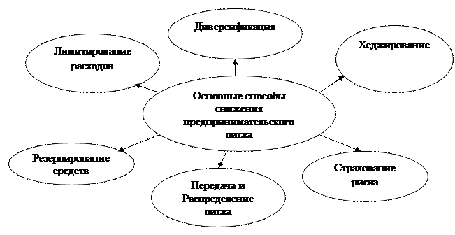 Рис. 3. Основные способы снижения риска Рассмотрим каждый из перечисленных способов снижения риска. Диверсификация – рассеивание риска за счет распределения капитала, активов между разнообразными объектами вложения или сочетание в пределах уставного капитала различных видов деятельности. Механизм диверсификации позволяет разделять риски и препятствует их концентрации, например: - ориентация на различные группы потребителей и на предприятия разных регионов. При этом предприятие должно стремиться к равномерному распределению долей каждого потребителя, чтобы отказ нескольких из них не сорвал реализационную программу в целом; - фирма в своей хозяйственной деятельности, предвидя падение спроса или заказов на основной вид работ, готовит запасные фронты работ или переориентирует производство на выпуск другой продукции [4, стр.50]. - увеличение числа поставщиков позволяет ослабить зависимость предприятия от ненадежных поставщиков, т.к. при нарушении ими графика поставок по разным причинам (аварии, банкротство, форс-мажорные обстоятельства) предприятие сможет относительно безболезненно переключиться на работу с другими поставщиками. - диверсификация кредитного портфеля предусматривает расширение круга покупателей и направлена на уменьшение кредитного риска предприятия. Применение фирмой диверсифицированного портфельного подхода на рынке ценных бумаг (комбинация разнообразных ценных бумаг) позволяет максимально снизить вероятность недополучения дохода. Диверсификация предусматривает два основных способа управления рисками - активный и пассивный. Активное управление представляет собой составление прогноза размера возможных доходов по основной хозяйственной деятельности от реализации нескольких инвестиционных проектов. Активная тактика фирмы по продвижению продукции предполагает, с одной стороны, пристальное отслеживание, изучение и реализацию наиболее эффективных инвестиционных проектов, захват значительной доли рынка со специализацией по однородному выпуску продукции, а с другой стороны, - максимально быструю переориентацию одного вида работ на другой, включая возможную передислокацию на другую территорию, рынок. Пассивное управление предусматривает создание неизменного рынка товаров с определенным уровнем риска и стабильное удерживание своих позиций в отрасли. Пассивное управление характеризуется низким оборотом, минимальным уровнем концентрации объемов работ. Лимитирование – установление норматива расходов. Данный механизм используется по тем видам рисков, которые не выходят за пределы допустимого их уровня, т.е. по финансовым операциям в зоне критического или катастрофического риска. По содержанию лимитирование концентрации рисков включает в себя: - предельный размер заемных средств, используемых в хозяйственной деятельности; - минимальный размер активов в высоколиквидной форме(краткосрочные финансовые вложения и дебиторская задолженность); - максимальный размер кредита, предоставляемого одному покупателю, направленный на снижение кредитного риска; - максимальный размер депозита, размещаемого в одном банке; - максимальный период отвлечения средств в дебиторскую задолженность. За счет этого финансового норматива обеспечивается лимитирование риска неплатежеспособности, а также 