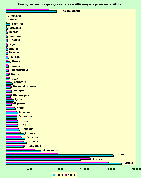 2010 год может стать рекордным по количеству российских туристов, выезжающих за рубеж. В 2008 году выездной туризм вырос на 21%. В прошлом году выездной туризм в России упал в среднем на 15% по сравнению с 2008 годом, а в нынешнем он растет на 20% по сравнению с 2009-м. При этом растет не только количество желающих выехать на отдых за рубеж, но и глубина продаж. Если в прошлом году туры покупали всего за неделю до поездки, то сейчас - заранее. На росте числа туристов в Европу сильно сказывается облегченная процедура выдачи виз в Испанию и Францию. Заявленное властями Греции и Италии облегчение в ближайшем будущем визового режима также повлияет на рост турпотока из России в эти страны. По данным на июнь в 2010 года, рост числа туристов по сравнению с первым полугодием прошлого года на Кубу составил 50%, на Мальдивы - 80%, в Таиланд - 70%. Лидеры по популярности за первые полгода - Турция, Египет, Испания, Греция, Таиланд, Кипр, Болгария, Тунис, Черногория, Хорватия, Доминикана и Чехия.
