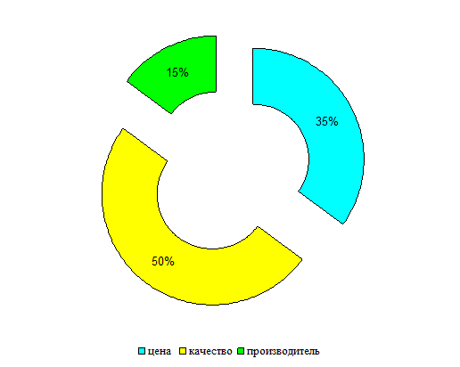 Рисунок 3. Распределение ответов респондентов по предпочтениям при выборе автошампуня Из данной диаграммы видно, что большинство респондентов выбирают тот автошампунь, который считают наиболее качественным, процент ответивших так равен 50%, на втором месте на выбор влияет цена 35%, и 15% ответили, что выбирают автошампунь по производителю. На диаграмме (рисунок 4) представлены факторы, влияющие на выбор автошампуня по стране производителя в городе Владивостоке.