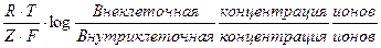 Рис.1 Внутри- и внеклеточные концентрации ионов для клетки теплокровного животного, ммоль/л. В нервных и мышечных клетках мембранный потенциал долго сохраняется постоянным, если клетка не активизируется какими-либо внешними факторами. Мембранный потенциал такой покоящейся клетки называется мембранным потенциалом покоя (МПП). Потенциал покоя нервной и мышечной клетки всегда отрицателен, его величина постоянна для каждого типа клеток и колеблется в диапазоне от –50 до –100мВ. Неравномерное распределение различных ионов между вне- и внутриклеточным пространством необходимо для существования потенциала покоя. Этот потенциал между внутриклеточной средой и межклеточной жидкостью возникает потому, что мембрана не является совершенным изолятором, а до некоторой степени проницаема для определенных ионов. Наиболее проницаема мембрана для ионов калия, несколько меньше для ионов хлора и еще менее проницаема для ионов натрия. В качестве примера, объясняющего механизмы трансмембранного движения ионов рассмотрим ток ионов калия. Можно представить, что мембрану пронизывают поры – каналы, через которые способны проходить ионы калия. Всякий раз, когда эти ионы наталкиваются на отверстие поры, они диффундируют через мембрану. Поскольку с внутренней стороны мембраны ионов калия намного больше, то такие столкновения будет происходить здесь гораздо чаще, чем снаружи, так что больше ионов будет проходить изнутри наружу, чем в обратном направлении. Наблюдается чистый выход ионов калия из клетки. При этом имеется сила, противодействующая этому процессу. Эта сила обусловлена электрическим зарядом ионов калия. По мере выхода калия из клетки уменьшается число положительно заряженных ионов на внутренней стороне мембраны. Одновременно увеличивается положительный заряд с внешней стороны мембраны. Возникающий при этом мембранный потенциал препятствует выходу катионов из клетки. Таким образом, выход положительных зарядов создаёт электрический потенциал, который мешает выходу других положительных ионов. Мембранный потенциал продолжает нарастать до тех пор, пока сила, препятствующая выходу калия, не станет равна осмотическому давлению калия. При таком уровне потенциала вход и выход калия находятся в равновесии, потому он называется калиевым равновесным потенциалом