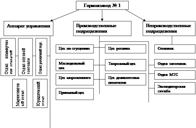 Схема 1 "Организационная структура КМК". Кемеровский молочный комбинат – крупнейшее молокоперерабатывающее предприятие Кузбасса. Предприятие (Гормолзавод № 1) работает в 2 смены, 600 смен за год по выработке цельномолочной продукции.