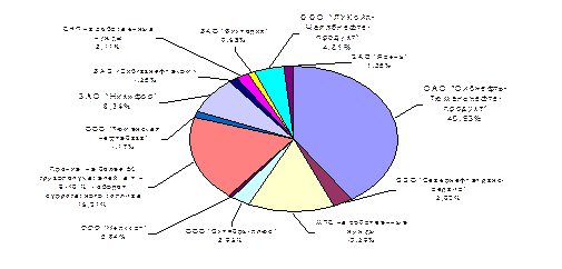 По данным таблицы 1.1 темпы роста оптовой реализации нефтепродуктов очень незначительны. При этом объем оптовой торговли нефтепродуктами на нефтебазах составляет порядка 60 – 70% от общей реализации. На сегодняшний день на оптовом рынке нефтепродуктов юга Тюменской области, общий объем потребления которого составляет около 600-650 тысяч тонн светлых нефтепродуктов в год, а ежегодный прирост по данным Тюменского областного комитета государственной статистики сохраняется на уровне 2%, действуют несколько крупных нефтепродуктосбытовых предприятий, занимающих 70-75% рынка (рис. 1.1).
