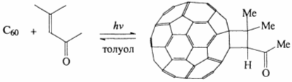 Виходи циклоаддуків, основані на поглиненому фулерені, складають в цій реакції 63-87%. Застосовуваність даного підходу здається вельми обмеженою. При опромінюванні о-метилбензофенона в присутності С60 спочатку утворюється циклоаддукт нестійкий і розщеплюється, утворюючи 1-(2-бензоїлфеніл)метил-1,2-дигідро-фулерен: