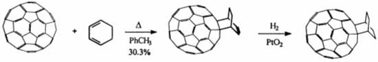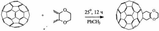 При кип'ятінні в толуолі 2,3,5,6,7,8-гексаметилиденбіцикло [2.2.2]октана з надлишком фулерена утворюється трис-аддукт Дільса— Альдера: