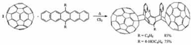 Використання двох еквівалентів фулерена дозволяє збільшити вихід біс(фулерено)пентацена до 16%. Введення арильних замісників в положення 6 і 13 пентацена веде до обороту селективності циклоприєдання. В цьому випадку з добрими виходами (85% для R=Ph; 75% для R = 4-гідроксифеніл; 5 екв. фулерена) отримані цис-бісфулеренові аддукти.