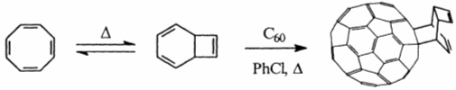 Для пояснення відмінності в поведінці незаміщеного і 6,13-ди- арилзамещених пентаценів Міллер і Мек використовували результати напівемпіричних розрахунків методом РМЗ, які показали, що при використанні біциклопентилідена як моделі фулерена у випадку утворення моноаддукта приєднання по центральному ядру (С(6) -С(13) ) вигідніше і термодинамічно (ентальпія утворення на 4.0 ккал/моль нижче) і кінетично (бар'єр активації на 1.4 ккал/моль нижче), ніж приєднання по атомах (С(5) -С(14) ). Введення арильних замісників в положення 6 і 13 приводить до обороту стабільності циклоаддуктів, як наслідок, до обороту реакційної здатності. Ця відмінність збільшується із збільшенням розміру дієнофіла. В умовах як кінетичного, так і термо- динамічного контролю син-бісаддукти переважають над трансізомерами. Це результат специфічної взаємодії фулеренових ядер, оскільки у разі циклоприєднання диметилового ефіру ацетилендикарбонової кислоти утворюються як син-, так і анти-біс-аддукти відносно 1:1.3. Для перевірки цього припущення автори провели реакцію циклоприєднання фулерена з 6,13-біс(триметилсилилетиніл)пентаценом, об'ємні замісники якого перешкоджають здійсненню стабілізуючої π-складчатої взаємодії між фулереновими ядрами в перехідному стані другої стадії циклоприєднання. Дійсно, в цьому випадку через 24 год кип'ятіння реагентів в сірковуглеці виділений моноаддукт з виходом 75%. Бісаддукти утворюються повільніше. В суміші присутні як цис-, так і транс-бісаддукт, хоча автори не змогли твердо встановити, який із стереоізомерів переважає (відношення двох ізомерів приблизно 2.5:1). Аддукти фулерена С60 з антраценом і його похідними цілком стабільні при кімнатній температурі, але розкладаються при нагріванні. Докладніше оборотність цієї реакції вивчена Саундерсом зі співробітниками спектроскопією ЯМР 3 Не з використанням 2 Не@С60 . При використанні великого надлишку (15 екв.) ДМА утворюється суміш моно-, біс-, трис- і тетраокисаддуктів. Константа рівноваги для утворення моноаддукта зменшується від 3600 при 295.4 К до 100 при 325.0 К. Для утворення біс-, трис- і тетракисаддуктів значення К2 , К3 і К4 при 295 К рівні 490, 41 і 2.3 л/моль. З температурної залежності значень К1 і К2 в інтервалі від 295.4 до 325.0 К отримані значення ∆G, ∆H, ∆S, рівні —4.8, —22.9 ккал/моль і —61.2 кал/моль•К для утворення моноаддукта, а також —3.7, —22.5 ккал/моль і -63.7 кал/моль•К для перетворення моноаддукта в бісаддукт. З цих величин можна розрахувати температури, при яких константа рівноваги рівна одиниці, тобто температури, при якій швидкість реакції Дільса—Альдера рівна швидкості зворотного процесу. Вони рівні 374 К для утворення моноаддукта і 353 К для його перетворення в бісаддукт. Аналогічні вимірювання для циклоприєднання фулерена С70 показують менше (в 4-7 разів) значення константи рівноваги для утворення моно- і бісаддуктів, що викликане менш негативним значенням теплового ефекту утворення аддукта (—21.1 ккал/моль для моноаддукта). Кінетичні і синтетичні аспекти оборотності [4+2]-циклоприєднання обговорені вище. Відомо, що циклооктатетраєн вступає в багато реакцій [4+2]-циклоприєднання після електроциклічної ізомеризації в біцикло[4.2.0]окта-2,4,7-триєн. Кип'тіння фулерена С60 в хлорбензолі з 5 екв. циклооктатетраєна дає з виходом 79% (48 год) відповідний циклоаддукт.