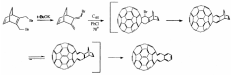 На відміну від дії NaI/18-краун-6, обробка 2,3-біс(бромо- метил)[2.2.2]окта-2,5-дієна трет-бутилатом калія дає в результаті дегідрогалогенування бромодієн. Що утворився в результаті взаємодії з фулереном аддукт цього дієна нестійкий і відщеплює НВг за умов реакції. В результаті утворюється похідне фулероциклогексадієна, яке, проте, недостатньо стабільно для виділення і розкладається, утворюючи незвичайний фулероїд: