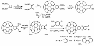Алкоксизамещені аддукти далі дією ВВг3 перетворювали в дигідроксипохідні, окиснення яких дає відповідні бензохінони. Генеруючий in situ біс-орто-хінодиметан приєднує дві молекули фулерена: