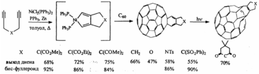 Аналогічні результати (без виділення дієна) отримані при використанні дипропаргілового ефіру і N,N-дипропаргілтозиламіна. Нагрівання η5 -біцикло[3.2.0]гепта-1,3 -дієнового комплексу кобальту в орто-дихлорбензолі також веде до утворення дієнового фрагмента, який захоплюється присутнім фулереном, утворюючи моно- і ізомерні біс-аддукти Дільса—Альдера з виходами 28 і 12%, відповідно: