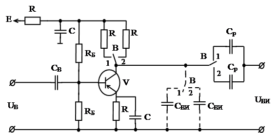 Рисунок 3 – Схема транзисторного підсилювача 5. Зняти амплітудну характеристику. Для цього поставити тумблери підсилювача в положення 1 та подавати від генератора на вхід сигнал частотою 400 Гц або 1000 Гц і змінювати його величину від 0 до 0,08 В. Зафіксувати показання вихідного вольтметра. Результати занести в таблицю 1. Таблиця 1