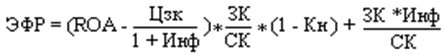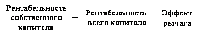 При увеличении собственного капитала возрастает финансовая устойчивость организации и снижается рентабельность собственных средств. В связи с этим утверждение, что для предприятия всегда целесообразно увеличение собственного капитала является неоднозначным. Собственных средств должно быть достаточно для обеспечения финансовой устойчивости. Задача финансового менеджмента на предприятии - обеспечив финансовую устойчивость, способствовать росту рентабельности собственного капитала. Финансовый рычаг можно рассчитать и другими способами: 1. Формула эффекта финансового рычага выводится следующим образом: допустим, что ROA - рентабельность совокупного капитала до уплаты налогов, %; Пусть БП - балансовая прибыль до налогообложения и уплаты налогов; ЧП - чистая прибыль; СК - среднегодовая сумма собственного капитала; Кн - коэффициент налогообложения, в виде десятичной дроби; Цзк - средневзвешенная цена заемного капитала, %; ЗК - среднегодовая сумма заемного капитала. Тогда рентабельность собственного капитала будет: ROЭ = ЧП / СК. Выделим из этой формулы составляющую с плечом финансового рычага, это и есть эффект финансового рычага (ЭФР): ЭФР = (1 - Кн)*(ROA - Цзк) * ЗК/СК. Эффект финансового рычага показывает, на сколько процентов увеличивается рентабельность собственного капитала за счет привлечения заемных средств. Рекомендуемое значение ЭФР равняется 0.33 - 0.5. Эффект финансового рычага возникает за счет разницы между рентабельностью активов и стоимостью заемных средств. Для более подробного анализа изменения значения эффекта финансового рычага и факторов повлиявших на это используют методику 5-ти факторный анализ эффекта финансового рычага. Эффект финансового рычага с учетом действия инфляции (долги и проценты по ним не индексируются) рассчитывается по следующей формуле[17] :